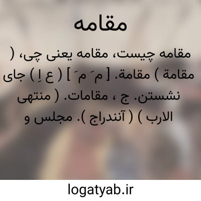 ( مقامة ) مقامة. [ م َ م َ ] ( ع اِ ) جای نشستن. ج، مقامات. ( منتهی الارب ) ( آنندراج ). مجلس و محل نشستن. ( ناظم الاطباء ). مجلس. ج، مقامات. ( اقرب الموارد ). و رجوع به مقامه شود. || گروه از مردم. ( منتهی الارب ) ( آنندراج ). جماعتی از مردمان. ( ناظم الاطباء ) ( از اقرب الموارد ). || بیان سرگذشت. شرح واقعه: المقامة فی معنی ولایةالعهد بالامیر شهاب الدوله مسعود و ماجری من احواله. ( تاریخ بیهقی چ فیاض ص 111 ).