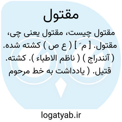 مقتول. [ م َ ] ( ع ص ) کشته شده. ( آنندراج ) ( ناظم الاطباء ). کشته. قتیل. ( یادداشت به خط مرحوم دهخدا ): خالد ندانست اینکه سیف الدوله مقتول شمشیر ماسوا و مقهور سنان و تیر اعدا نگردد. ( ترجمه تاریخ یمینی چ 1 تهران ص 458 ). اگر تو آیی و یا این مقتول را به من سپاری مقبول است... ( مرزبان نامه چ قزوینی ص 64 ). امارت آن موضع به پسر حسن حاجی مقتول داد. ( جهانگشای جوینی چ قزوینی ج 1 ص 67 ). باقی مردان را بر لشکر قسمت کردند هر یک مرد قتال را بیست و چهار نفس مقتول رسید. ( جهانگشای جوینی چ قزوینی ج 1 ص 101 ). آنچه ظاهر بوده است و معین بیرون مقتولان در نقبها و سوراخها... هزار هزار و سیصد هزار و کسری در احصا آمده. ( جهانگشای جوینی چ قزوینی ص 128 ).