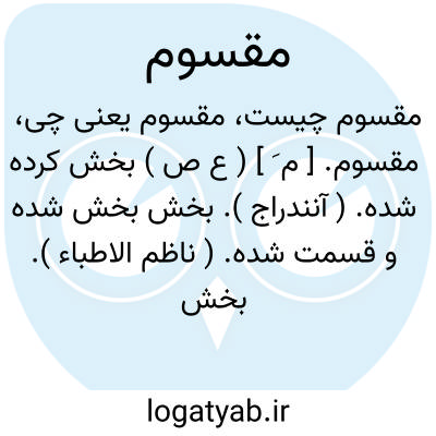 مقسوم. [ م َ ] ( ع ص ) بخش کرده شده. ( آنندراج ). بخش بخش شده و قسمت شده. ( ناظم الاطباء ). بخش شده. بخشیده. ( یادداشت به خط مرحوم دهخدا ): لها سبعة ابواب لکل باب منهم جزء مقسوم. ( قرآن 44/15 ). زمین مقسوم است به چهار قسم به دو دایره یکی را دایرة الآفاق خوانند دو دیگر را خط الاستوا خوانند. ( حدود العالم ). هر ناحیتی از این نواحی مقسوم است به اعمال و اندر هر عملی شهرهاست بسیار. ( حدود العالم ).