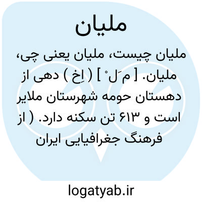 ملیان. [ م َل ْ ] ( اِخ ) دهی از دهستان حومه شهرستان ملایر است و 613 تن سکنه دارد. ( از فرهنگ جغرافیایی ایران ج 5 ).
