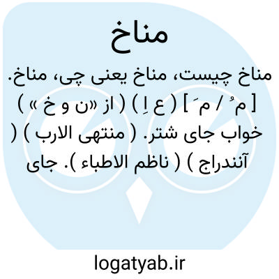 مناخ. [ م ُ / م َ ] ( ع اِ ) ( از «ن و خ » ) خواب جای شتر. ( منتهی الارب ) ( آنندراج ) ( ناظم الاطباء ). جای خوابانیدن شتر. ( از اقرب الموارد ) ( از محیط المحیط ). آنجا که شتران را بخوابانند. محل فرودآوردن و خوابانیدن شتر. مَبرَک. شترخان. ( یادداشت به خط مرحوم دهخدا ). || محل اقامت: هذا مناخ سوء؛ یعنی اینجا اقامتگاه بدی است. ( از اقرب الموارد ). محل خواب و جای آسودگی. ( غیاث ) ( آنندراج ):