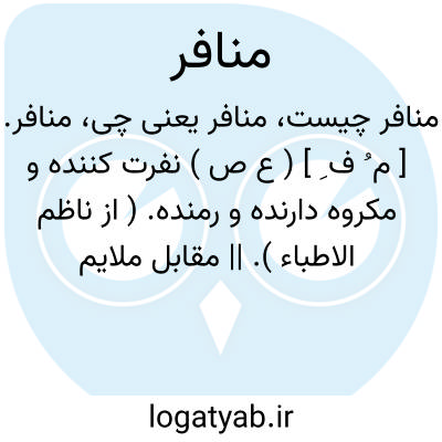 منافر. [ م ُ ف ِ ] ( ع ص ) نفرت کننده و مکروه دارنده و رمنده. ( از ناظم الاطباء ). || مقابل ملایم: غضب قوه ای است در حیوان دفع منافر را، و شهوت قوه جلب ملایم را.( یادداشت به خط مرحوم دهخدا ). دوم قوت جنباننده که به تأیید او حیوان بجنبد و بدانچه ملایم اوست میل کنند و از آنچه منافر اوست بگریزد. ( چهارمقاله ص 11 ).