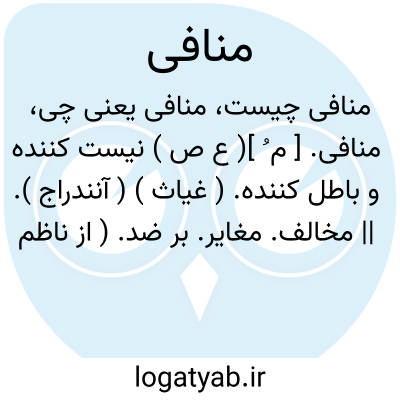منافی. [ م ُ ]( ع ص ) نیست کننده و باطل کننده. ( غیاث ) ( آنندراج ). || مخالف. مغایر. بر ضد. ( از ناظم الاطباء ). ناسازگار. ناسازوار. ( یادداشت به خط مرحوم دهخدا ): مناقضه و تناقض در شعر و سایر کلام آن است که معنی دوم مناقض و منافی معنی اول باشد. ( المعجم چ دانشگاه ص 289 ). آنچه گفتیم که عدالت هیئتی نفسانی است منافی آن نبود که گفتیم عدالت فضیلتی نفسانی است. ( اخلاق ناصری ). خیر خلق منافی مطلوب او بود. ( اخلاق ناصری ). کذب منافی این غرض است. ( اخلاق ناصری ). چه داندکه منافی حال اوست. ( مصباح الهدایه چ همایی ص 70 ). تعرض حقیقی از جهت استنشاق نفحات ربانی منافی صدق نبود. ( مصباح الهدایه ایضاً 135 ). اما هر بدعت که مزاحم و منافی سنتی نبود... ( مصباح الهدایه ایضاً ص 146 ).