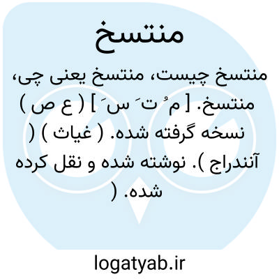 منتسخ. [ م ُ ت َ س ِ ] ( ع ص ) نسخه گیرنده. ( غیاث ) ( آنندراج ). آنکه نسخه می نویسد و نسخه برمی دارد. ( ناظم الاطباء ). || ناسخ. ( از آنندراج ). آنکه محو می کند و نسخ می نماید. ( ناظم الاطباء ):