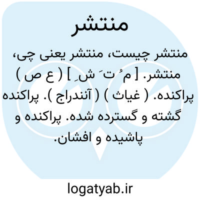 منتشر. [ م ُ ت َ ش ِ ] ( ع ص ) پراکنده. ( غیاث ) ( آنندراج ). پراکنده گشته و گسترده شده. پراکنده و پاشیده و افشان. ( از ناظم الاطباء ). پراکنده. پریشان. متفرق. ( یادداشت به خط مرحوم دهخدا ): خشعاً أبصارهم یخرجون من الأجداث کأنهم جراد منتشر. ( قرآن 7/54 ).