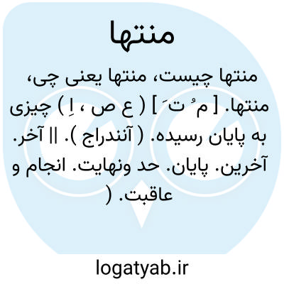 منتها. [ م ُ ت َ ] ( ع ص، اِ ) چیزی به پایان رسیده. ( آنندراج ). || آخر. آخرین. پایان. حد ونهایت. انجام و عاقبت. ( از ناظم الاطباء ). انجام. فرجام. کران. کرانه. بن. تک. ته. سر. انتها. غایت. مقابل مبتدا. ( یادداشت به خط مرحوم دهخدا ):