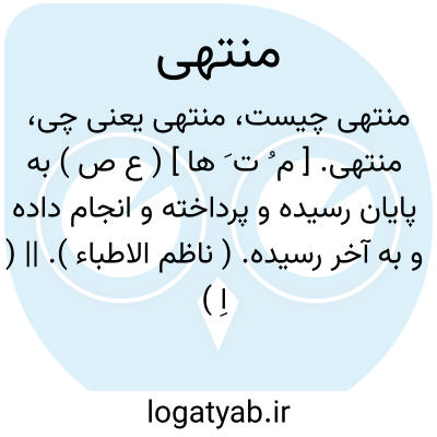 منتهی. [ م ُ ت َ ها ] ( ع ص ) به پایان رسیده و پرداخته و انجام داده و به آخر رسیده. ( ناظم الاطباء ). || ( اِ ) نهایت. گویند: هو بعیدالمنتهی. ( از اقرب الموارد ): و اءَن َّ اًلی ربک المنتهی. ( قرآن 42/53 ). رجوع به منتها شود.