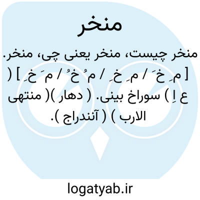 منخر. [ م ِ خ َ / م ِ خ ِ / م ُ خ ُ / م َ خ ِ ] ( ع اِ ) سوراخ بینی. ( دهار )( منتهی الارب ) ( آنندراج ). سوراخ بینی. ج، مناخر. ( ناظم الاطباء ). بینی و گویند سوراخ آن. ج، مناخر. ( از اقرب الموارد ). هر یک از دو سوراخ بینی. تثنیه آن منخرین. ( یادداشت مرحوم دهخدا ). رجوع به منخرین شود.