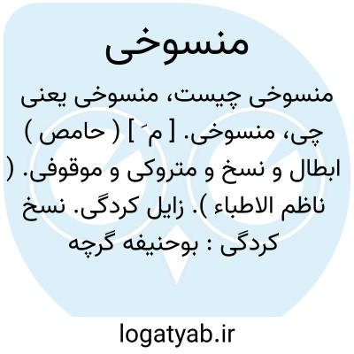 لغت نامه دهخدا منسوخی. [ م َ ] ( حامص ) ابطال و نسخ و متروکی و موقوفی. ( ناظم الاطباء ). زایل کردگی. نسخ کردگی: بوحنیفه گرچه بود اندر شریعت مقتداکس نشست از آب منسوخی سخنهای زفر.سنائی.