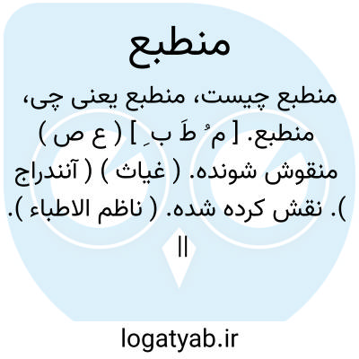 منطبع. [ م ُ طَ ب ِ ] ( ع ص ) منقوش شونده. ( غیاث ) ( آنندراج ). نقش کرده شده. ( ناظم الاطباء ). || سرشته. سرشته شده. مجبول: تجویف اول از دماغ که قابل است به ذات خویش مر جمله صورتها را که حواس ظاهر قبول کرده باشند و در ایشان منطبع شده. ( چهار مقاله ص 13 ). خسرو از غایت رعیت پروری... که طبع او بر آن منطبع بود نخواست که جزئیات احوال رعایا... بر او پوشیده بماند. ( مرزبان نامه چ قزوینی ص 166 ). || رام شده و دست پرورده و مطیع و فرمانبردار. || فلزی که نرم و قابل کوفته شدن باشد. || چاپ شده. ( ناظم الاطباء ).