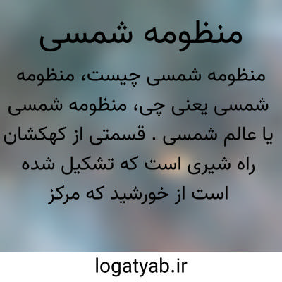 منظومه شمسی یا عالم شمسی. قسمتی از کهکشان راه شیری است که تشکیل شده است از خورشید که مرکز منظومه شمسی است و نه سیاره اصلی دیگر و عده زیادی سیاره های کوچک که همگی بدور خورشید درگردشند. ۶ سیاره از سیارات نه گانه اصلی دارای یک یا چند قمر میباشند ( قمر زمین از بزرگترین اقمار منظومه شمسی است ). نام سیارات نه گانه بترتیب فاصله از خورشید عبارتند از: عطارد زهره زمین مریخ مشتری زحل اورانوس نپتون پلوتن.