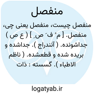 منفصل. [ م ُ ف َ ص ِ ] ( ع ص ) جداشونده. ( آنندراج ). جداشده و بریده شده و قطعشده. ( ناظم الاطباء ). گسسته: ذات وی... نه در جهت و نه به عالم متصل و نه منفصل. ( کیمیای سعادت چ احمد آرام ص 784 ). پیوسته نیست و منفصل نیست بلکه... ( کیمیای سعادت ایضاً ص 784 ). دست فنا از دامن بقاشان منفصل. ( منشآت خاقانی چ محمد روشن ص 327 ). ردیف قافیت کلمه ای باشد مستقل منفصل از قافیت که بعد از اتمام آن در لفظ آید. ( المعجم چ مدرس رضوی ص 258 ). چون حروف رابطه از روی منفصل باشد و به تخلل الف قطعکلمه مفرد شود، ردیف گردد. ( المعجم ایضاً ص 266 ).