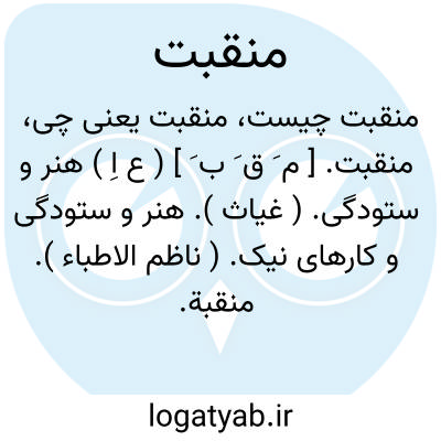 منقبت. [ م َ ق َ ب َ ] ( ع اِ ) هنر و ستودگی. ( غیاث ). هنر و ستودگی و کارهای نیک. ( ناظم الاطباء ). منقبة. ج،مناقب. آنچه موجب ستایش و مباهات باشد:
