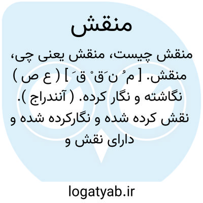 منقش. [ م ُ ن َق ْ ق َ ] ( ع ص ) نگاشته و نگار کرده. ( آنندراج ). نقش کرده شده و نگارکرده شده و دارای نقش و نگار و دارای تصاویر و رنگهای گوناگون. ( ناظم الاطباء ). نگارین. بنگار. نقاشی شده. پرنقش و نگار. ( یادداشت مرحوم دهخدا ): از او مخمل و جامه های بسیار خیزد ساده و منقش. ( حدود العالم ).