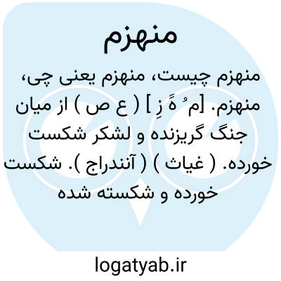 منهزم. [م ُ هََ زِ ] ( ع ص ) از میان جنگ گریزنده و لشکر شکست خورده. ( غیاث ) ( آنندراج ). شکست خورده و شکسته شده و لشکر شکست خورده و مغلوب شده و فرارکرده. ( از ناظم الاطباء ). شکست خورده. به هزیمت شده. گریخته. شکسته ( در جنگ ). شکسته ( سپاه ). ( یادداشت مرحوم دهخدا ):