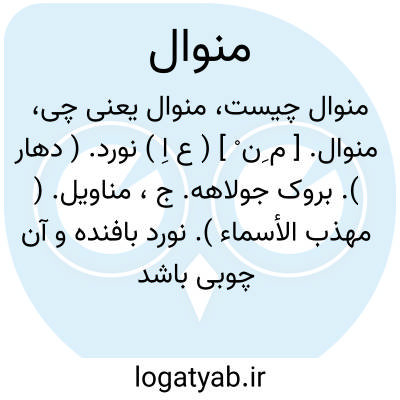 منوال. [ م ِن ْ ] ( ع اِ ) نورد. ( دهار ). بروک جولاهه. ج، مناویل. ( مهذب الأسماء ). نورد بافنده و آن چوبی باشد مدور. ( منتهی الارب ). چوبی باشد که جولاهگان هر قدر جامه بافته میشود بر آن پیچند. ( آنندراج ). نورد جولاهگان و نورد. یقال: هم علی منوال واحد؛ ایشان بر یک نوردند در خوی و جز آن. ( از اقرب الموارد ) ( ناظم الاطباء ). || جولاه. ( ناظم الاطباء ). خودجولاه را نیز گویند. ( از اقرب الموارد ). || سزاواری. یقال: منوالک ان تفعل کذا؛ ای ینبغی لک وحقک. ( منتهی الارب ) ( ناظم الأطباء ). || وجه. نسق. اسلوب. ( اقرب الموارد ). طرز. طور. طریقه و دستور و ترتیب نهاد و خوی. ( ناظم الاطباء ). لاادری علی ان منوال هو؛ ای علی ای وجه هو. افعل علی هذا المنوال؛ یعنی بر این روش و اسلوب. ( از اقرب الموارد ): هر طایفه بر حسب معتقد خود تقریر کردند هم برآن منوال بی تغییر و تصرف در قلم آورد. ( رشیدی ). گرگ نیز هم بر این منوال فصلی بگفت. ( کلیله و دمنه ).