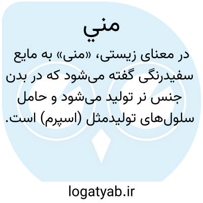 ( اسم ) ماده نیمه چسبناک مایل به سفیدی که دارای بویی مخصوص است و در مواقع تحریکات شدید جنسی حیوانات نر از غده های جنسی ( بیضه ها ) و دیگر غده های وابسته به اندام تناسلی نر خارج میشود. غیر از ترشحات غدد پروستات و غدد کوپر ترشحات مخاط مجاری ناقل منی در ترکیب منی دخالت دارند. خروج منی بواسطه مقاربت یا احتلام ( رویاهای جنسی ) یا استمنائ انجام میشود. در هنگام تحریکات شدید شهوی منی از راه مجرای ادرار از نوک حشفه آلت بخارج میجهد و خروج آن عملی غیر ارادی و انعکاسی است و مرکز انعکاسش در نخاع کمری است. در منی سلولهای جنسی نر یعنی اسپرماتوزوئیدها وجود دارند و همین اسپرماتوزوئید ها تخمک ( سلول جنسی ماده ) را بارور میکند و در نتیجه تخم و جنین بوجود میاید آب مرد آب پشت: [ اگر دین بقیاس بود غسل در اراقت بول واجب آمدی و آبدست در خروج منی. ] ( کشف الاسرار ۵۳۱:۲ )