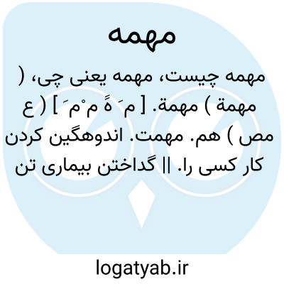 مهمة. [ م ُ هَِ م ْم َ ]( ع ص ) تأنیث مهم. ج، مهمات. در اندوه اندازنده. || مجازاً ضروری، چرا که کار ضروری آدمی را در اندوه و غم می اندازد. ( غیاث ). رجوع به مهم شود.