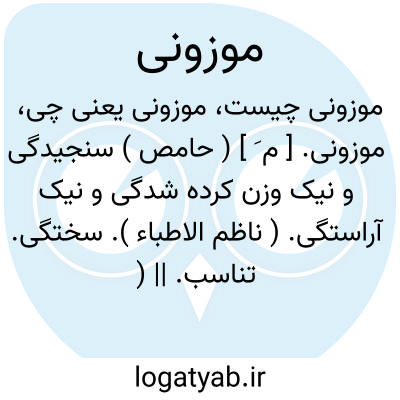 موزونی. [ م َ ] ( حامص ) سنجیدگی و نیک وزن کرده شدگی و نیک آراستگی. ( ناظم الاطباء ). سختگی. تناسب. || ( اصطلاح عروضی ) نیک سنجیده و دارای وزن بودن شعر. ( از ناظم الاطباء ).