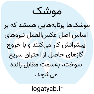 زود برد این خبر به موشانا.عبید زاکانی. || عضله. ماهیچه. ( یادداشت مؤلف ). الیه. ( دهار ): حماة؛ موشک گوشت ساق. الیه. موشک ساق. ( منتهی الارب ). || نوعی از آتش بازی. ( ناظم الاطباء ). قسمی آتش بازی. ( شرفنامه ج 2 ص 264 ). قسمی آتش بازی که در آن آلتی از کاغذ کلاهک مانند و به شکل موش سازند و درون آن باروت و شوره ریزند و فتیله نهند و چوبی دم آسا بر آن تعبیه کنند و آتش زنند و بر هوا پرتاب کنند. ( یادداشت مؤلف ): صدهزار چراغ بر ریسمانها تعبیه کنند و موشکها بر اطراف آن بندند بر وجهی که چون یک چراغ برافروزند موشک بر آن ریسمانها دویده به هر چراغ که رسد روشن سازد. ( حبیب السیر چ 1 خاتمه ص 43 ). || فشنگ. ( ناظم الاطباء ). || قسمی کشتی تندرو. ( یادداشت مؤلف ). || ( اصطلاح نظامی ) قسمی از آلات ناریه جنگ که بیشتر در دریا به کشتی دشمن افکنند. قسمی سلاح انفجاری. نوعی از بمب محتوی مواد منفجره. ( یادداشت مؤلف ). آلتی جهنده که به فضا پرتاب شود. موشک مجهز به موتور جت و دارای همه گونه وسیله لازم برای پیشروی است. قوه انفجاری که بر اثر احتراق بنزین در انتهای موشک پدید می آید قدرت جهشی در آن به وجود می آورد که موشک را به جلو می راند. موشک دارای دو یا سه طبقه است و هنگامی که خود را به مدار زمین می رساند قسمتهای اضافی آن که مخزن گاز و نیرو هستند و قوه محرکه موشک را تشکیل می دهند جدا می شوند و به زمین می افتند و فقط اطاقک موشک - که حامل سرنشین و تجهیزات فنی و وسایل لازم است - در مدارزمین قرار می گیرد و به موجب قوانین حرکت اجرام سماوی به مسیر خود ادامه می دهد. موشک دارای فرمانهای دستی است و فضانوردان با کمک این فرمانها موشک را هدایت می کنند. موشک دارای فلز مرکبی است که قدرت مقاومت شگفت انگیز دارد و اشعه خورشید و عوامل جوی نمی توانندروی آن اثر بگذارند. پیش از آن که فضانورد بخواهد فرود آید باید سفینه فضایی یک نیم دور بچرخد بطوری که پشت فضانورد در جهت حرکت قرار گیرد و او بتواند با کاهش شتاب مقاومت کند. در این هنگام فضانورد دستگاههای ترمزکننده را به حرکت درمی آورد و از سرعت سفینه می کاهد و وقتی که اطاقک فضانورد در هشت هزارگزی زمین است، دستگاههای ترمزکننده دایم از سرعت اطاقک میکاهدو سرانجام فضانورد با چترنجات فرود می آید. موشکهای فضایی مجهز به یک دستگاه تهیه هوا هستند. این دستگاه نه فقط دایماً هوای تازه تهیه می کند، بلکه درجه نسبی هوا را نیز حفظ می نماید و درجه حرارت را همواره بیست درجه سانتی گراد نگه می دارد. دو دوربین تلویزیون موشک همیشه مراقب وضع فضانورد است و تصاویر او رابه زمین می فرستد. دستگاه تلفن برای مکالمه با زمین،مخزن ذخیره غذا و دستگاههای مختلف خبرگیری و فیلم برداری و ضبط صدا نیز در موشکها تعبیه می شود. موشک انواعی دارد. که به کیفیت پرتاب آن بستگی دارد از قبیل زمین به زمین و زمین به هوا و قاره پیما و غیره.
