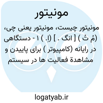 (مُ تُ ) [ انگ. ] (اِ. ) ۱ - دستگاهی در رایانه (کامپیوتر ) برای پاییدن و مشاهدة فعالیت ها در سیستم پردازشی به منظور تحلیل های بعدی، صفحة نمایش رایانه، نمایش گر. ۲ - (در مخابرات ) شخص یا سیستم ناظر بر محیط یا صحنه یا دستگاه، پایش گر. (فره ).