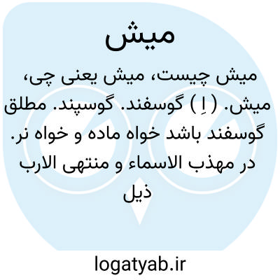 میش. ( اِ ) گوسفند. گوسپند. مطلق گوسفند باشد خواه ماده و خواه نر. در مهذب الاسماء و منتهی الارب ذیل کلمه ٔنعجه آمده است ماده میش؛ پس میش باید نر هم داشته باشد و دهار در کلمه العافظة می نویسد میشینه نر و بزینه. گوسپند اعم از نر و ماده در قدیم به معنی ضأن یعنی گوسفند می آمده است اعم از نر و ماده. گویا در قدیم میش به جنسی می گفته اند که امروز گوسفند می گوییم و اعم از نر و ماده و پشم دار است. و گوسفند اطلاق می شده است هم بر میش ( یعنی گوسفند در معنی امروزی که پشم دارد ) و هم بر بز اعم از نر و ماده. به عبارت بهترامروز بطور مطلق بر آنچه موی و پشم دارد گوسفند اطلاق می شود و در قدیم میش اطلاق می شده است و بالعکس در قدیم بر آنچه پشم دارد گوسفند اطلاق می شده است و این شامل موی داران این ها نمی شده است. بزل. میشینه مقابل بزینه. ( از یادداشت مؤلف ). ضأن. ( نصاب الصبیان ) ( یادداشت مؤلف ) ( ترجمان القرآن جرجانی ) ( منتهی الارب ) ( دهار ). غریس. قرار. سَدَف. ( منتهی الارب ):
