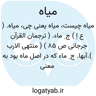 ( اسم ) جمع مائ آبها: دوزخ آشامان دریا در زشیهه رخش او بی خبر گردند و نشناسند نیران از میاه. ( عثمان مختاری ) یا دایره میاه. دایره میرابی. یا میاه سائله. ( اسم ) ماده ای نیمه جامد و صمغی شکل که از جوشاندن پوست گونه ای گل سرخ که در جزایر بحر احمر و سواحل این دریا میروید بدست میاید پوست این گیاه را آن قدر در آب میجوشانند که آب غلظت کافی پیداکند و ماده نیمه جامد مذکور پس از سرد شدن حاصل شود. در طب قدیم این ماده را جهت عفونت های مزمن مجرای ادرار بکار میبردند.