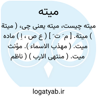 میته. [ م َ ت َ ] ( ع اِ ) صورتی از میتة که در فارسی متداول است. جیفه. مردار: اکل میته حرام است. در ضرورت اکل میته حلال باشد. از باب اکل میته.