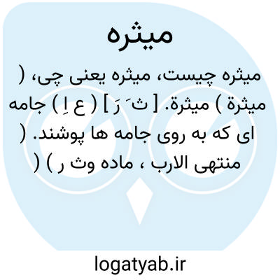 ( میثرة ) میثرة. [ ث َ رَ ] ( ع اِ ) جامه ای که به روی جامه ها پوشند. ( منتهی الارب، ماده وث ر ) ( آنندراج ) ( ناظم الاطباء ). || بالشچه مانندی که پیش زین نهند. ( منتهی الارب ) ( آنندراج ) ( ناظم الاطباء ). آنچه بر روی زین افکنند تا نشست سوار آسان بود. ج، مواثر، میاثر. ( مهذب الاسماء ). || نمدزین. ج، مواثر، میاثر. ( منتهی الارب ) ( ناظم الاطباء ) ( آنندراج ). || مرکبی از حریر و دیبا که معمول مردم ایران بوده. ( ناظم الاطباء ). مرکبی از حریر و دیبا. ( منتهی الارب ) ( آنندراج ). || پوست شیر و دیگر ددان.( ناظم الاطباء ). پوست دد. ( منتهی الارب ) ( آنندراج ).