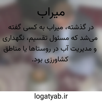 میر آب: نگهبان آب، کسی که آبرابخانه هاوباغهاوکشتزارهاتقسیم میکند، آبیار، میراو هم گفته شده