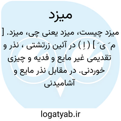 ( اسم ) ۱ - ( زردشتی ) نذر و تقدیمی غیر مایع و فدیه چیزی خوردنی در مقابل نذر مایع و آشامیدنی ( زور ). ۲ - مجلس بزم و عشرت: ای به میزد اندرون هزار فریدون ای به نبرد اندرون هزار تهمتن. ( فرخی )