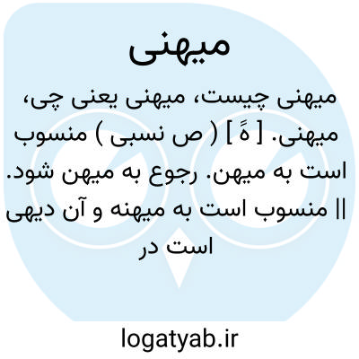 میهنی. [ هََ ] ( ص نسبی ) منسوب است به میهن. رجوع به میهن شود. || منسوب است به میهنه و آن دیهی است در خراسان و زادگاه شیخ ابوسعید ابوالخیر باشد. ( از یادداشت مؤلف ). منسوب است به میهنه که از قراء خابران از نواحی سرخس باشد. ( از لباب الانساب ).