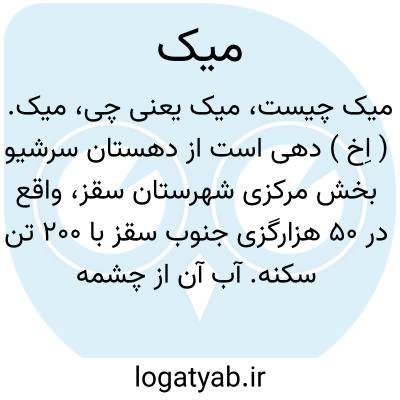 میک. ( اِخ ) دهی است از دهستان سرشیو بخش مرکزی شهرستان سقز، واقع در 50 هزارگزی جنوب سقز با 200 تن سکنه. آب آن از چشمه و رودخانه و راه آن مالرو است. ( از فرهنگ جغرافیائی ایران ج 5 ).