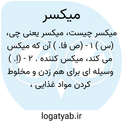 (س ) ۱ - (ص فا. ) آن که میکس می کند، میکس کننده. ۲ - (اِ. ) وسیله ای برای هم زدن و مخلوط کردن مواد غذایی، همزن (فره ). ۳ - دستگاهی با محفظه ای خمره ای شکلِ گردان برای ساختن بتون.