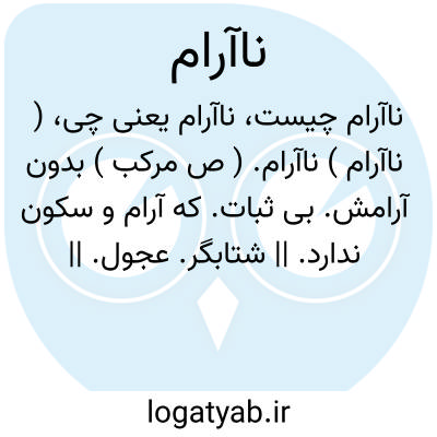 ( نا آرام ) ( صفت ) ۱ - آنکه آرام و سکون ندارد. ۲ - شتابنده عجول. ۳ - نا آسوده بیقرار. ۴ - ناامن پر آشوب مقابل آرام.