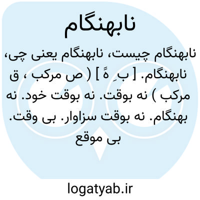 ( صفت ) ۱ - بی وقت بی موقع: نابهنگام بهارم که به دی مه شکفم که بهنگامه نیسان شدنم نگذارند. ( خاقانی ) ۳ - نابجا بیمورد بیجا: گرستن بهنگام باسوک و درد به از خنده نابهنگام سرد. ( گرشا. ) مقابل بهنگام