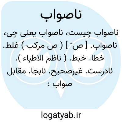 ناصواب. [ ص َ ] ( ص مرکب ) غلط. خطا. خبط. ( ناظم الاطباء ). نادرست. غیرصحیح. نابجا. مقابل صواب: امیر گفت این همه ناصواب است که خواجه می گوید و این کارها به تن خویش پیش خواهم گرفت. ( تاریخ بیهقی ص 267 ). اکنون چنین مصیبت بیفتاد که سوی مرو می رود و ما را ناصواب می نماید. ( تاریخ بیهقی ). پشت به غزنی و هندوستان کردن ناصوابست. ( تاریخ بیهقی ص 453 ).