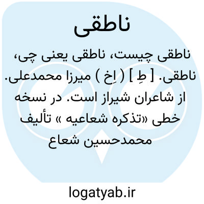 ناطقی. [ طِ ] ( اِخ ) میرزا محمدعلی. از شاعران شیراز است. در نسخه خطی «تذکره شعاعیه » تألیف محمدحسین شعاع شیرازی از او ذکری رفته است. رجوع به فرهنگ سخنوران ص 590 شود.