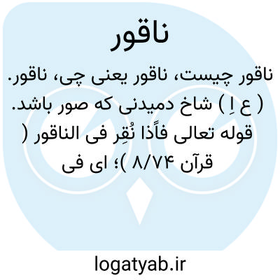 ناقور. ( ع اِ ) شاخ دمیدنی که صور باشد. قوله تعالی فاًذا نُقِر فی الناقور ( قرآن 8/74 )؛ ای فی الصور. ( منتهی الارب ). صور. ( ترجمان علامه جرجانی ). صور اسرافیل و هر بوق. ( فرهنگ نظام ). نای بزرگ را هم گفته اند که کرنای باشد و در عربی صور اسرافیل را خوانند. ( برهان قاطع ) ( آنندراج ). صور یا بوقی که دمیده می شود در آن. ( ازالمنجد ) ( از اقرب الموارد ). صور که روز محشر هنگام نشر خلایق در آن دمیده می شود. ( از معجم متن اللغة ). صور و شاخی که در آن میدمند. ( ناظم الاطباء ). نای بزرگ. صور. ( غیاث اللغات از لطایف و منتخب اللغات ). نقیر. ج، نواقیر. || قلب. ( معجم متن اللغة ).
