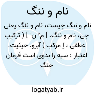 ( اسم ) آبرو حیثیت اعتبار: بگذر از نام و ننگ خود حافظ. ساغرمی طلب که مخموری. ( حافظ ) یابانام وننگ.با غیرت غیرتمند: نکردی بشهر مداین درنگ دلاور سری بود با نام وننگ. یاروزنام وننگ.روززور آزمایی درمیدان جنگ: بوقت کارزارخصم وروزنام وننگ او فلک برگردن آویزدشغاونیم لنگ او. ( فرخی لغ. )