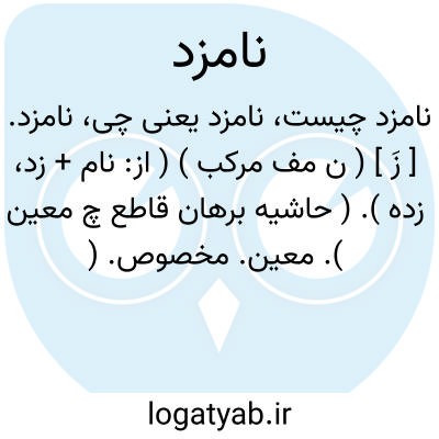 ( صفت ) نام برده.۲ - شخص معین شده (برای کاروشغلی )منصوب:[ وهریک راباامینی متدین ازقبل دیوان اعلی نامزدقطری ازاقطار ممالک نمود.] ۳ - تعیین شده ( کاروشغل محل ) برای کسی:[ ودردل کرده بودکه مارابه ری ماندوخراسان وتخت ملک نامزدمحمدباشد.] ۴ - پسریادخترجوانی که برای زناشویی با همسر آینده خوددرنظرگرفته شده: [ ایشان را بنگر که تا چند روزگار شد که نامزد یکدیگرند و دست برهم ننهاده اند ] ۵ - نام زدن:[ و از اثر آن نامزد بر دلت تیرگی بیفتد.