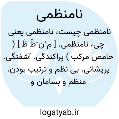 نامنظمی. [ م ُن َظْ ظَ ] ( حامص مرکب ) پراکندگی. آشفتگی. پریشانی. بی نظم و ترتیب بودن. منظم و بسامان و مرتب نبودن.