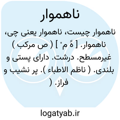 ( صفت ) ۱ - دارای پستی وبلندی غیرمسطح ۲ - ناتراش ناتراشیده صیقلی نشده. ۳ - بی نظم بی ترتیب.۴ - نابرابر نامساوی ۵ - ناجوربی تناسب.۶ - نامستقیم معوج پیچ وخم دار.۷ - آنچه که اجزائاش بیکدیگر ماننده نباشد.یاشعرناهموار.شعری که یکنواخت نباشدشعردارای غث وسمین.۸ - خودرای خودسر بی ادب.یافرزندناهموار. فرزند بدخوی و تربیت ناپذیر: زنان بار دار ای مرد هوشیار. اگر وقت ولادت مار زایند. از آن بهتر بنزدیک خردمند که فرزندان ناهموار زایند. ( گلستان.چا. آیتی.۹ ) ۱۶۳ - نادرست نامعقول ناشایسته.یاسخن ناهموار. سخن ناشایسته ونامعقول.