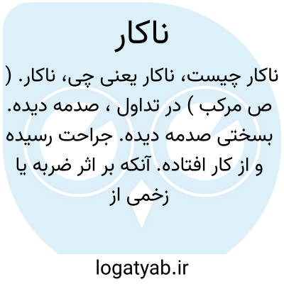 ناکار. ( ص مرکب ) در تداول، صدمه دیده. بسختی صدمه دیده. جراحت رسیده و از کار افتاده. آنکه بر اثر ضربه یا زخمی از کار افتاده باشد.