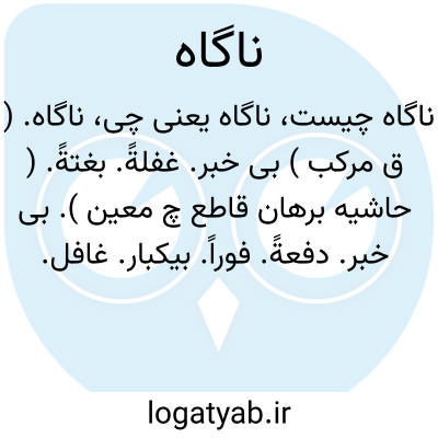 ناگاه. ( ق مرکب ) بی خبر. غفلةً. بغتةً. ( حاشیه برهان قاطع چ معین ). بی خبر. دفعةً. فوراً. بیکبار. غافل. ( از ناظم الاطباء ). ناکاج. فجاءةً. بداهةً. نابیوسان. ناگهان. ناگه. ناگاهان.به ناگه. به ناگاه. به ناگاهان. به ناگهان: