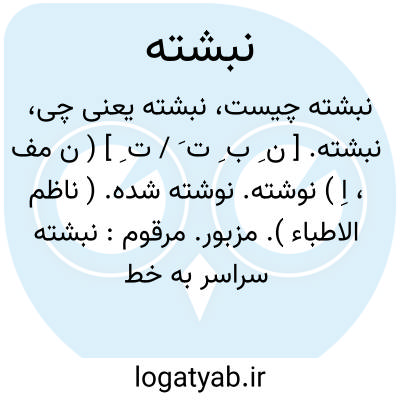۱ - ( اسم ) نوشته شده مرقوم:...این کتاب نبشته بزبان تازی وبه اسنادهای دراز بود.۲ - ( اسم ) مکتوب دست خط نامه. ۳ - سند. ۴ - حکم فرمان. ۵ - نقاشی شده مصور: بگنجورگفت آن درفشان حریر نبشته براوصورت دلپذیر... ( شا.لغ. ) ۶ - مقدرمحتوم: که کارخدایی نه کاریست خرد قضای نبشته نشایدسترد. ( شا.لغ. ) یانبشته بودن برسرکسی.مقدربودن برای وی: نبشته چنین بدمگربرسرت که پردخته ماندزتوکشورت. ( شا.لغ. )