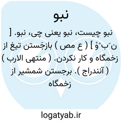 نبو. [ ن َب ْوْ ] ( ع مص ) بازجَستن تیغ از زخمگاه و کار نکردن. ( منتهی الارب ) ( آنندراج ). برجستن شمشیر از زخمگاه و کار نکردن آن. ( از ناظم الاطباء ). واپس جستن شمشیر. ( تاج المصادر بیهقی ) ( ازمعجم متن اللغة ) ( از اقرب الموارد ) ( از المنجد ). || کوتاهی کردن و نرسیدن تیر به هدف. ( از منتهی الارب ) ( ناظم الاطباء ). کوتاهی کردن و اصابت نکردن تیر. ( از اقرب الموارد ) ( از معجم متن اللغة ). || برداشته شدن چشم از چیزی بسوی دیگری، و در حدیث احنف است: قدمنا علی عمرولیلی وفد فنبت عیناه عنهم و وقعت علی؛ یعنی دیده از آنان برداشت و بدیشان ننگریست. ( از اقرب الموارد ) ( از محیط المحیط ). || کند گشتن بینائی. ( منتهی الارب ) ( ناظم الاطباء ). || زشت گردیدن صورت چندانکه چشم انکار کند از آن. ( منتهی الارب ) ( از معجم متن اللغة ) ( از اقرب الموارد ) ( از ناظم الاطباء ) ( از المنجد ). || نفرت کردن و نپذیرفتن طبع چیزی را. ( از اقرب الموارد ) ( از المنجد ). نفرت کردن طبیعت از چیزی و نپذیرفتن آن را. ( از ناظم الاطباء ). || موافق نیامدن جای کسی را. ( از اقرب الموارد ) ( از المنجد ) ( ازآنندراج ). موافق میل نیامدن و پسند نشدن منزل و فراش کسی را. ( از ناظم الاطباء ) ( از معجم متن اللغة ). || قرار نیافتن در جائی. ( از معجم متن اللغة ). به جای قرار ناگرفتن. ( زوزنی ) ( تاج المصادر بیهقی ) ( از معجم متن اللغة ) ( از المنجد ). || قرار نیافتن زین و پالان بر پشت ستور. ( از معجم متن اللغة ). || آرام نیافتن پهلوی کسی بر بستر. ( از منتهی الارب ) ( از ناظم الاطباء ) ( از معجم متن اللغة ) ( از اقرب الموارد ) ( از المنجد ). || جفا کردن. ( از معجم متن اللغة ) ( از المنجد ). || دور شدن. ( از منتهی الارب ) ( از ناظم الاطباء ) ( آنندراج ). || دوری جستن از کسی. ( ناظم الاطباء ). || منقاد نشدن چیزی یا کاری کسی را. ( از اقرب الموارد ) ( از معجم متن اللغة ) ( از المنجد ). || زایل کردن چیزی را. ( از المنجد ) ( از معجم متن اللغة ). || فربه شدن. ( از معجم متن اللغة ). || ( اِمص ) علو. ارتفاع. ( المنجد ).