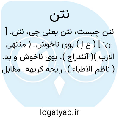 نتن. [ ن َ ت ِ ] ( ع ص ) بدبوی. ( از ناظم الاطباء ) ( از اقرب الموارد ) ( از معجم متن اللغة ) ( از المنجد ). نَتُن. ( از معجم متن اللغة ). نَتین. ( از اقرب الموارد ). مِنْتِن. مُنْتُن. ( از معجم متن اللغة ): شی نتن؛ چیز بدبوی. ( ناظم الاطبا ). تأنیث آن نَتْنی ̍ است. ( از المنجد ).
