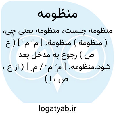منظومه. [ م َ م َ / م ِ ] ( از ع، ص، اِ ) تأنیث منظوم. منظومة. ( یادداشت مرحوم دهخدا ). رجوع به منظوم شود. || هر چیز واقعشده در صف و قطار و در نظم. ( ناظم الاطباء ).