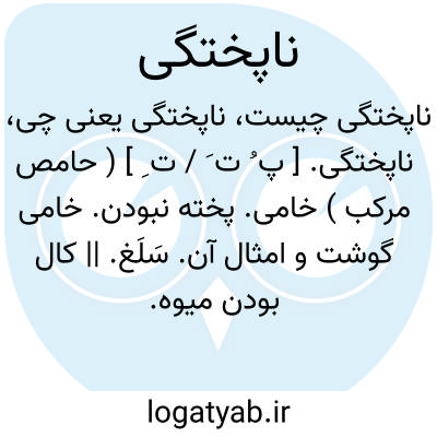 ناپختگی. [ پ ُ ت َ / ت ِ ] ( حامص مرکب ) خامی. پخته نبودن. خامی گوشت و امثال آن. سَلَغ. || کال بودن میوه. نارس بودن. || بی تجربگی. ناآزمودگی. ناسنجیدگی. || جلفی. بی وقاری. سبکی. سبکسری. بی احتیاطی. بی وقاری.